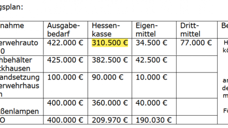 „Ich möchte meine Anfragen vom 28. August 2025 näher konkretisieren. Die Stadtverordnetenversammlung beschloss am 4. Oktober 2021 diverse Projekte zur Hessenkasse anzumelden. Der Tischvorlage zur Anmeldung zur Hessenkasse ist zu entnehmen, dass das „Feuerwehrauto LF 10“ mit einem Ausgabebedarf von 422.000 Euro mit 310.500 Euro bezuschusst werden sollte: